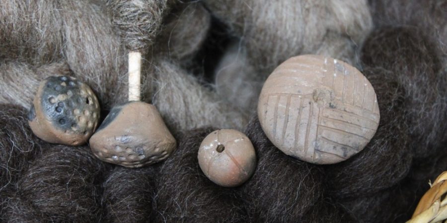 Im ersten Jahresviertel hat Maara mir gezeigt, wie man mit dem Rocken spinnt. Dabei wandert die Hand, die die Spindel antreibt, immer weiter zur Seite. Im Gegensatz zur Fallspindel ist also diese Art zu Spinnen auch gut dazu geeignet, im Sitzen zu Spinnen (mit Fallspindel im Sitzen ist es zumindest bei mir kaum ein Meter Faden, der so hergestellt werden kann).Diesen Vorteil habe ich dann mal auf einer längeren Zugfahrt ausgenutzt und an meiner Technik gefeilt. Mir fällt es nämlich schwer, mit den Fingern der Spindel genügend Schwung zu geben, aber auf der Fahrt klappte es immer besser und die Finger gewöhnten sich an das Drehen der Spindel. Ich habe Übrigens ohne Rocken gearbeitet und immer einige Fasern in die Hand genommen und von dort ausgezogen. Ein Handrocken wäre wohl noch eine transportable Möglichkeit, aber auch ohne ist es kein Problem 😉Für die angespitzten Stöckchen haben wir verschieden schwere Tonwirtel erwerben können, die für uns in einem Grubenbrand hergestellt wurden. Mit den schönen Wirteln macht das Spinnen gleich noch einmal so viel Freude.