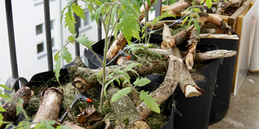Die Äste haben einen weiteren Vorteil: Sie sorgen dafür, dass der Rasenschnitt, den ich zum Mulchen gesammelt habe, nicht vom Wind weggeweht wird. Für Stadtbewohner habe ich übrigens eine Quelle für Rasenschnitt aufgetan 😀 Ein bisschen raus und spazieren gehen muss man dafür schon. Aber wenn man aufmerksam ist bemerkt man den Rasenschnitt nach dem Mähen in Parks und auf den Wiesen. Davon kann man sich ja mal einen Beutel voll sammeln und auf den Balkonkisten und Pflanzsäcken verteilen. Eins kann ich versprechen: man wird außerordentlich lustig beäugt bei der Sammelei, aber das kenne ich ja schon =D