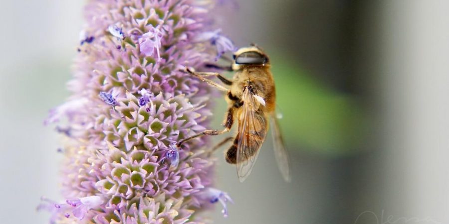 Letztes Jahr kam diese Besucherin häufig zu uns auf den Balkon geflogen. Die Fotos sind so schön malerisch geworden 🙂 Ein viel zu übler Name für das hübsche Tier – Mistbiene, Schlammbiene, oder wenn man es länger mag: Scheinbienen-Keilfleckschwebfliege. Honigfliege wäre doch was, so schön goldig wie sie ist, oder?